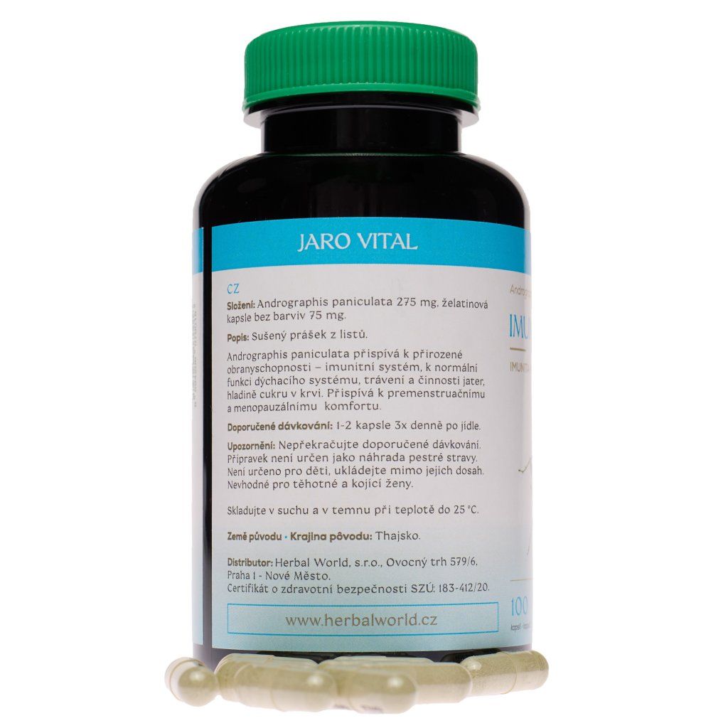 | Složení: | Andrographis paniculata 275 mg, želatinová kapsle bez barviv 75 mg. |