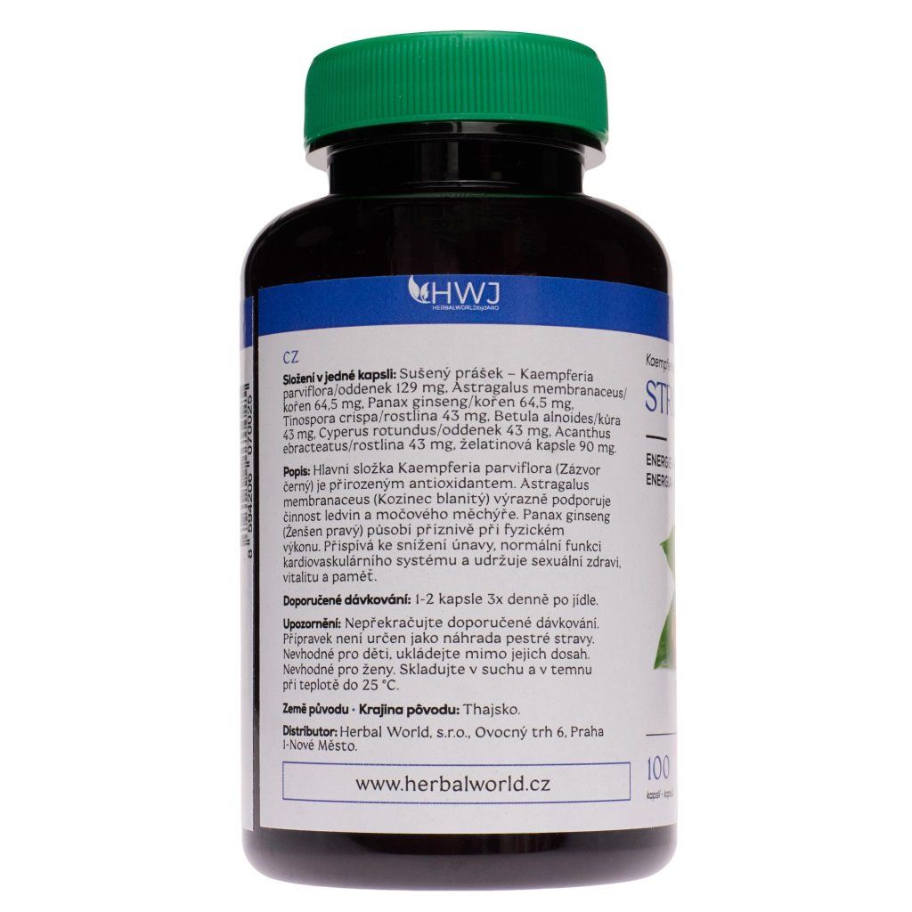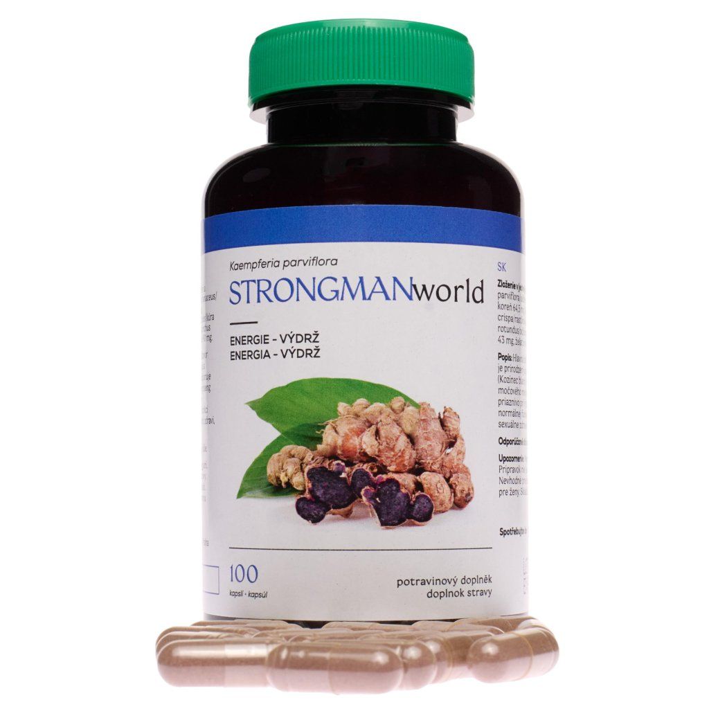 Originál obsahující byliny a plodiny pěstované na plantážích v jižní Asii, v současnosti dostupný pouze u nás! 100% garance kvality. Nejvýše zastoupenými složkami STRONG(WO)MANworld jsou Kaempferia Parviflora, Astragalus membranaceus a Panax ginseng. Hlavní složka Kaempferia Parviflora (Zázvor černý) je přirozeným antioxidantem. Astragalus membranaceus (Kozinec blanitý) výrazně podporuje imunitní systém, normální činnost cévní soustavy, ledvin a močového měchýře, přispívá ke zvýšení pohyblivosti kloubů a pomáhá normalizovat hladinu cukru v krvi. Panax ginseng (Ženšen pravý) působí příznivě při fyzickém výkonu. Přispívá ke snížení únavy, normální funkci kardiovaskulárního systému a udržuje sexuální zdraví, vitalitu a paměť.